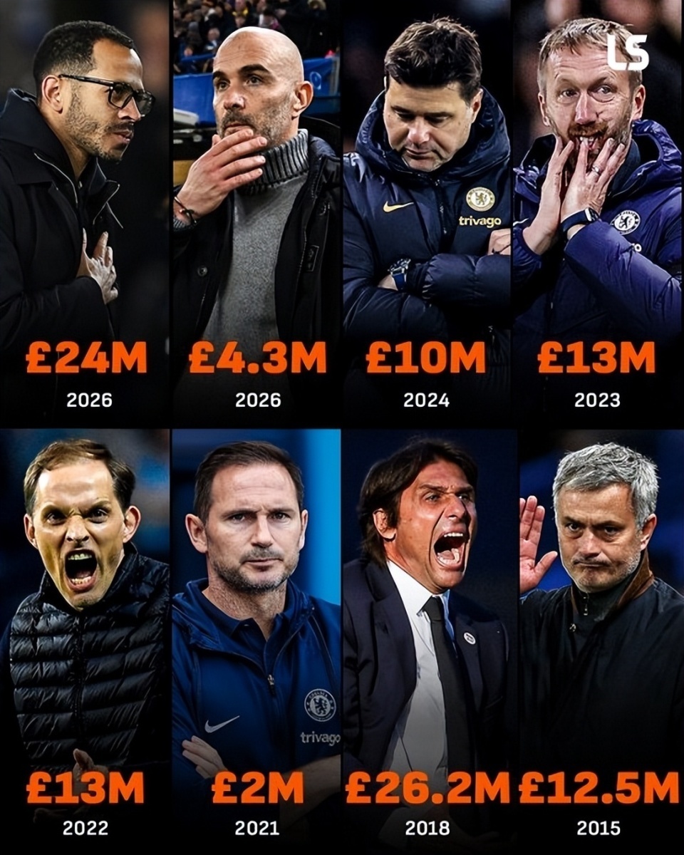 最近10年,切尔西已经解雇了10名主帅,其中包括希丁克、孔蒂、萨里、兰帕德(2次)、图赫尔、波特、波切蒂诺、马雷斯卡、罗塞尼尔。数据机构LiveScore指出,切尔西2015年以来为解雇主教练已经支付了超过1亿镑的违约金!